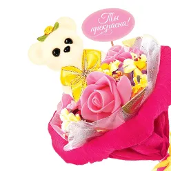 • Средний - роза - 9 шт., гипсофила, упаковка, лента