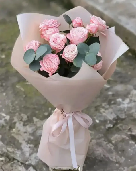 Нежный и утончённый букет из кустовых роз пудрово-розового оттенка, дополненный ароматными веточками эвкалипта, словно создан для самых тёплых чувств. Лёгкость и воздушность композиции подчёркивают естественную красоту цветов, а мягкие розовые тона символизируют искренность, заботу и романтику. Эвкалипт добавляет свежесть и изысканную текстуру, делая букет стильным и современным. Такой букет станет идеальным способом выразить нежные эмоции, сказать «спасибо», «люблю» или просто подарить радость без повода.