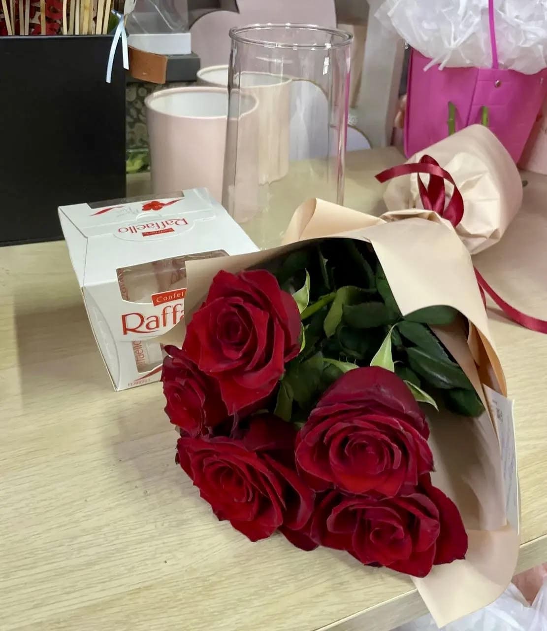 Букет из пяти красных роз — это изящное и выразительное проявление чувств, где каждая деталь говорит о любви и восхищении.