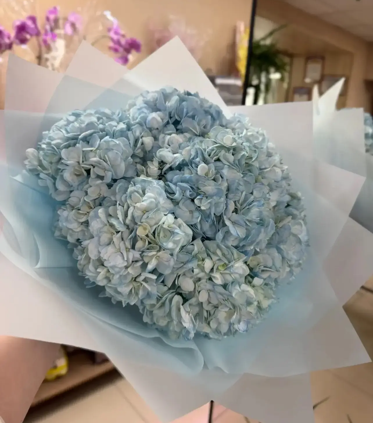 Букет из 7 голубых гортензий - это воплощение нежности, гармонии и утончённой красоты. Идеально подойдёт для подарка на день рождения, признание в чувствах, благодарность или просто чтобы порадовать близкого человека без повода.