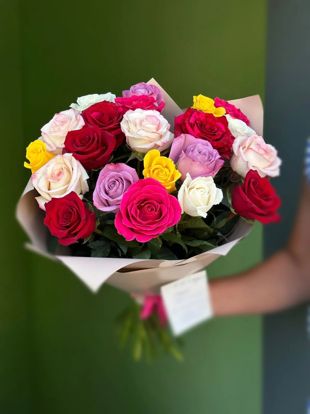 В мире не существует вещей ярче и веселее, чем букет из роз нескольких цветов. Невероятно нежный и в тоже время яркий букет из разноцветных роз. Отличный подарок к празднику для любимой или знакомой вам молодой девушки.