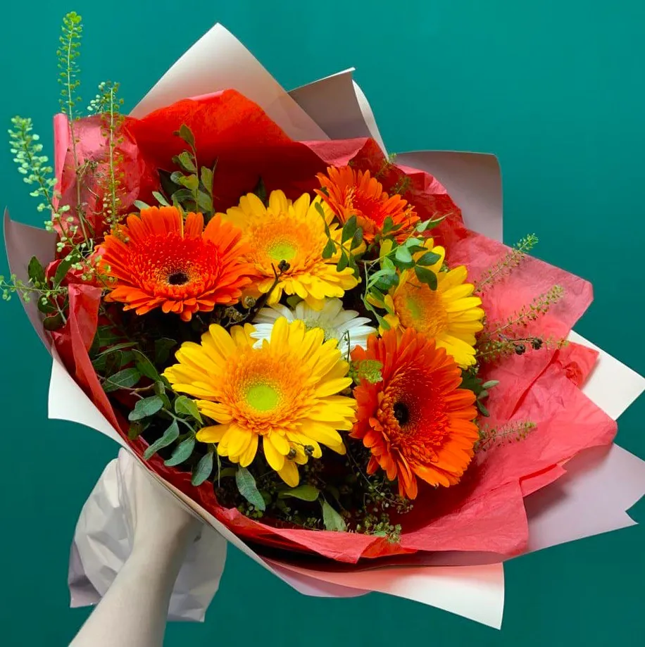 Представьте себе яркий букет из гербер, словно солнечные лучи, которые вошли в ваш дом. Каждый цветок — это яркое настроение, наполненное жизненной энергией и радостью. Герберы в красных, оранжевых и желтых оттенках гармонично переплетаются, создавая живописный калейдоскоп красок.