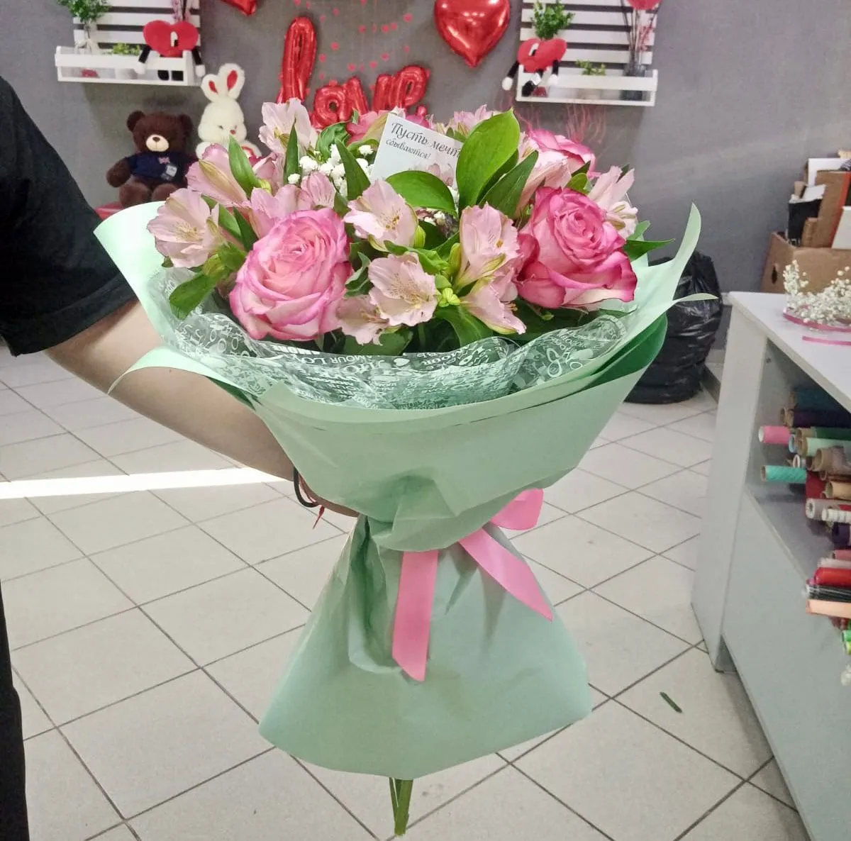 Состав букета: розы ,альстромерии, зелень, упаковка, лента