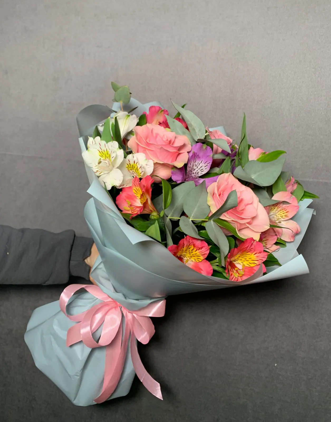 Состав букета: розы ,альстромерии, зелень, упаковка, лента