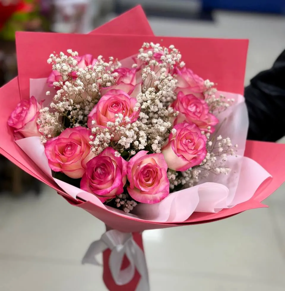 • Средний - роза - 9 шт., гипсофила, упаковка, лента