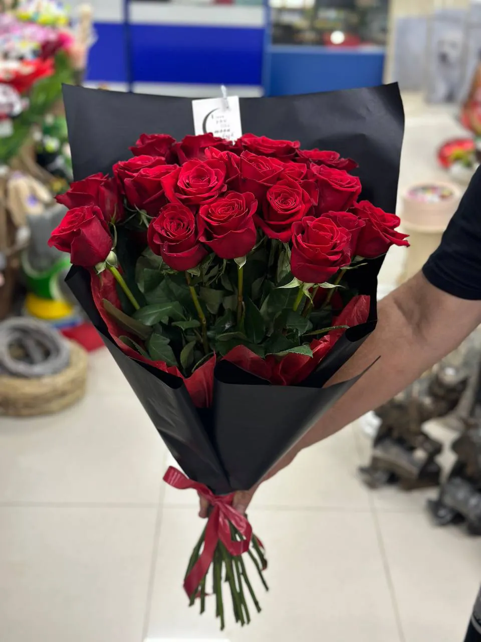 Черная упаковка обвивает стебли, словно обнимая их, подчеркивая хрупкость и грацию роз, придавая букету нотку загадочности. Этот гармоничный союз цветов и упаковки символизирует страсть и страстные чувства, приглашая нас в мир волшебства и любви. Такой букет станет не только подарком, но и настоящим произведением искусства, способным украсить любое торжество или внести яркий акцент в повседневность.