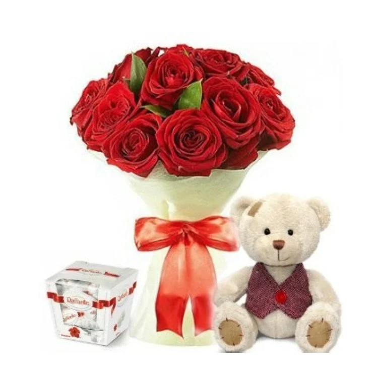 • Средний - 15 роз, игрушка, Раффаэлло 150 гр.