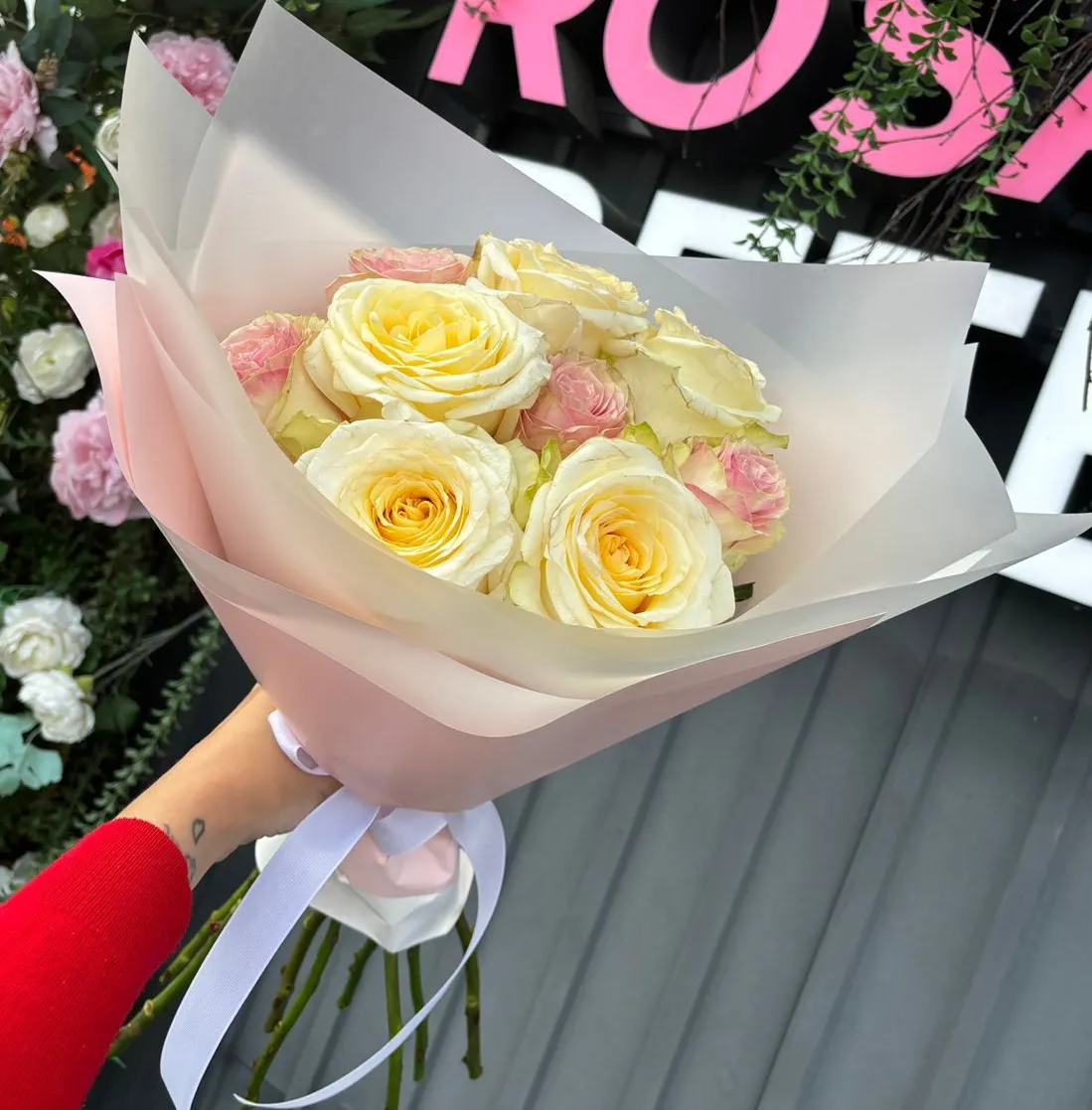 Букет из белых и розовых роз — это истинное воплощение нежности и утонченной красоты. Белые розы, символизирующие чистоту и гармонию, плавно смешиваются с нежными розовыми бутонами, которые олицетворяют любовь и заботу. Каждая роза в этом букете словно прошептала свои чувства, создавая идеальное сочетание, которое способно растопить сердце.