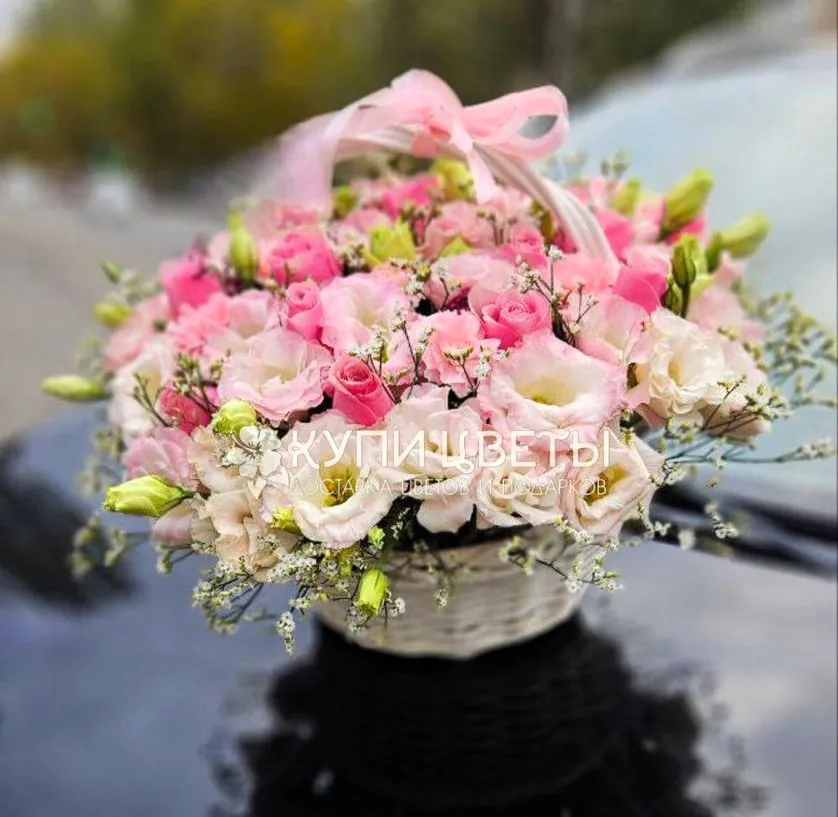 Розы, эустома, гвоздика, зелень, оазис, корзина