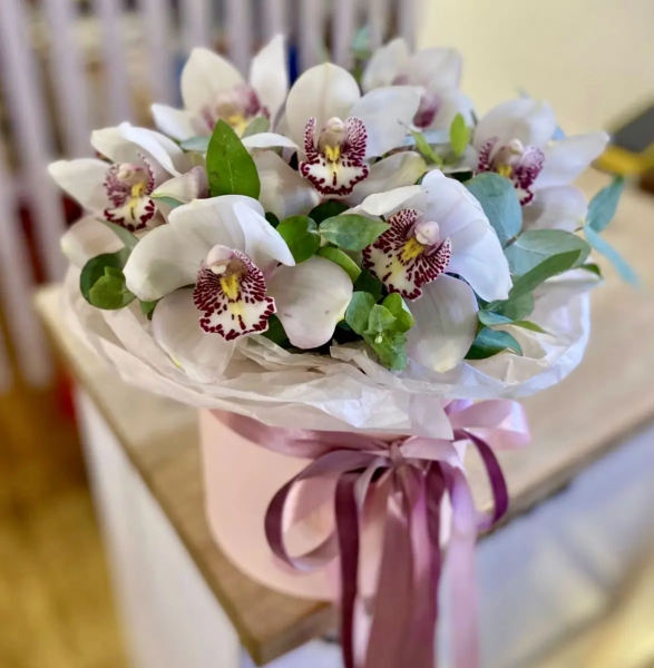 Элегантная шляпная коробка придаёт букету современный и роскошный вид, а гармоничное сочетание воздушных лепестков и сочной зелени наполняет его лёгкостью и природной свежестью.