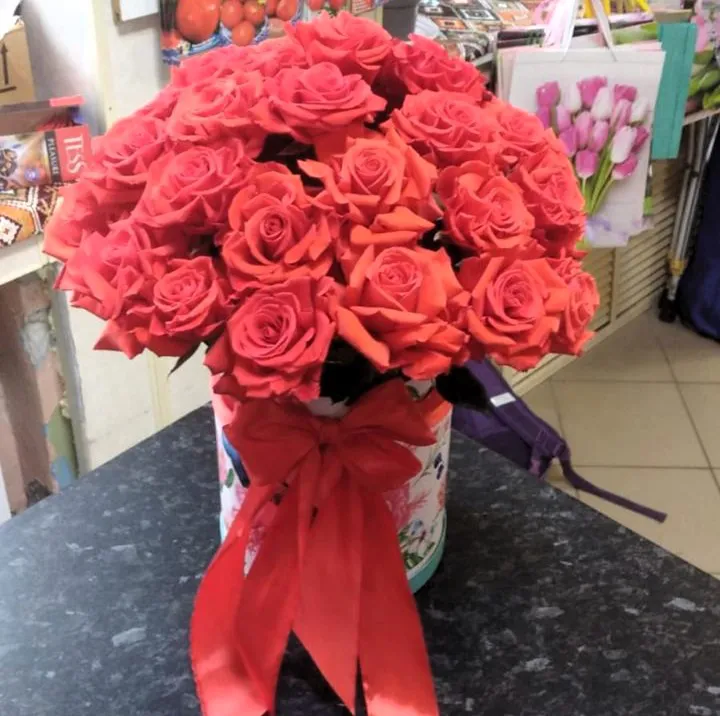 • Средний-25 роз, шляпная коробка, оазис