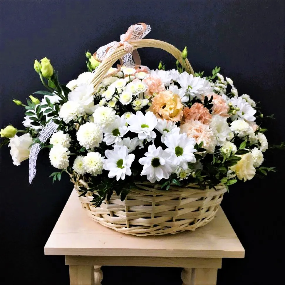 Хризантемы, эустомы, гвоздика,зелень, оазис, корзина