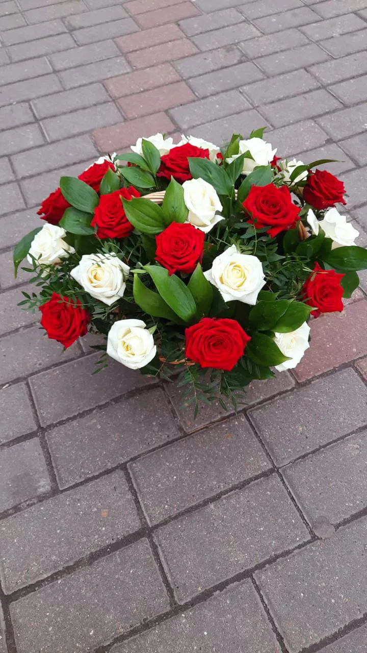 Красные и белые одноголовые розы, зелень, оазис, корзина