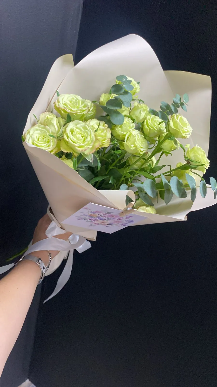 Букет из белых кустовых роз и эвкалипта — это ода нежности и утонченной элегантности. Белые розы, символизирующие чистоту и невинность, распускаются в гармоничном единстве, их бархатные лепестки излучают мягкое сияние. Каждая роза подобна маленькому произведению искусства, излучающему свежесть и красоту.