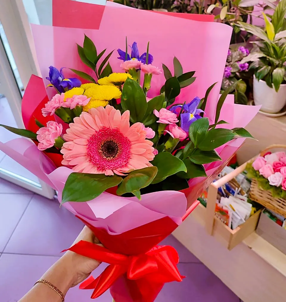 Этот сборный букет из гербер, гвоздик, хризантем и ирисов — настоящая симфония цвета и формы. Яркие герберы с их широкими, словно солнечные лучи, лепестками придают букету жизнерадостность и энергию. Утонченные гвоздики добавляют нотки элегантности, их нежные, волнистые края создают контраст с более крупными цветами.