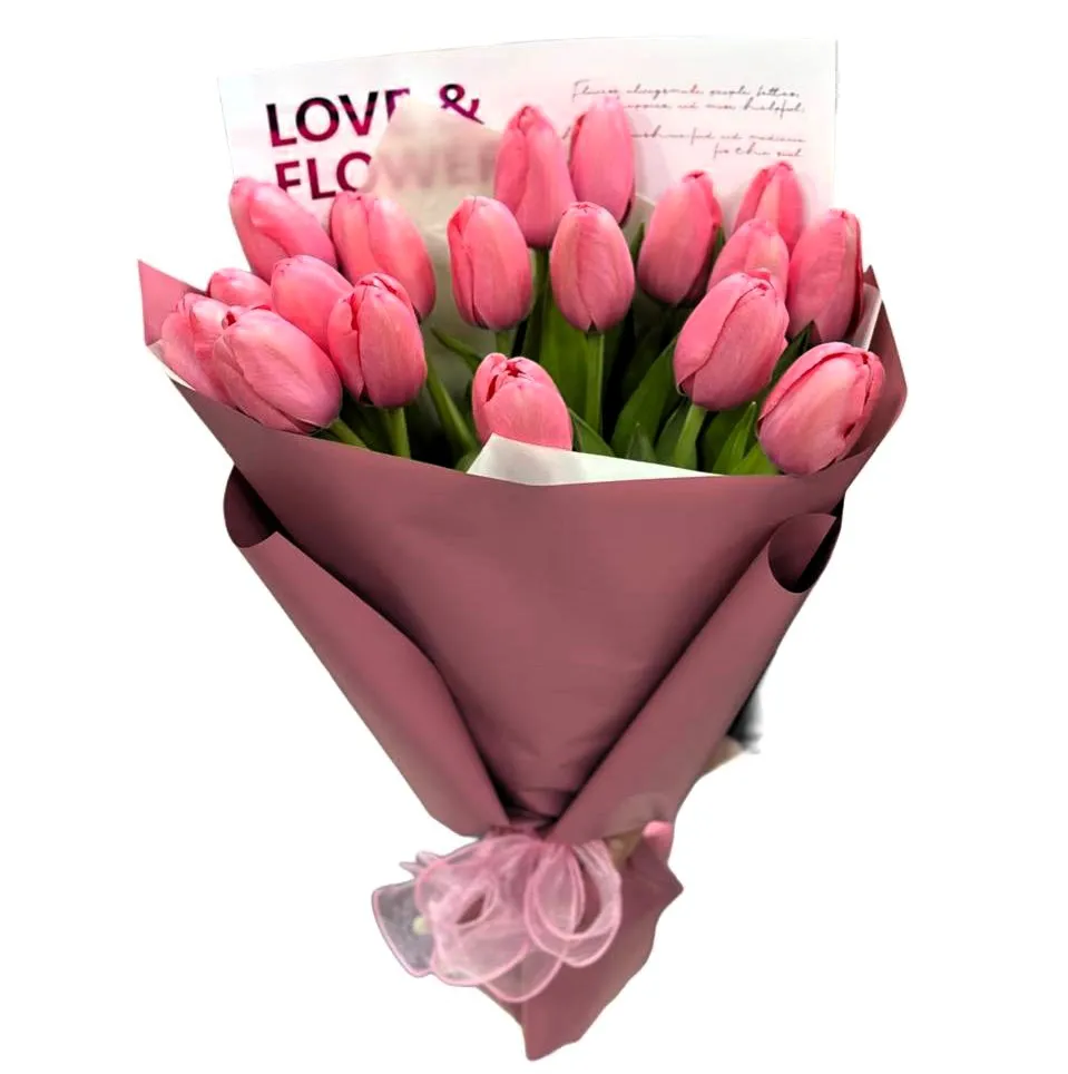 Каждый тюльпан в букете излучает мягкий, романтичный свет, а их утончённая форма добавляет изысканности. Композиция из розовых тюльпанов способна украсить любой интерьер, наполняя пространство свежестью и уютом.