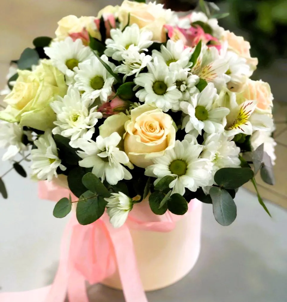 Этот великолепный букет создаст атмосферу тепла и радости, которую невозможно забыть. Шляпная коробка с розами и хризантемами в нежных тонах — это идеальное украшение для любого торжества. Элегантный букет, собранный из мягких пастельных оттенков, дарит уют и гармонию. Розы символизируют любовь и нежность, а хризантемы придают композиции свежесть и оригинальность.