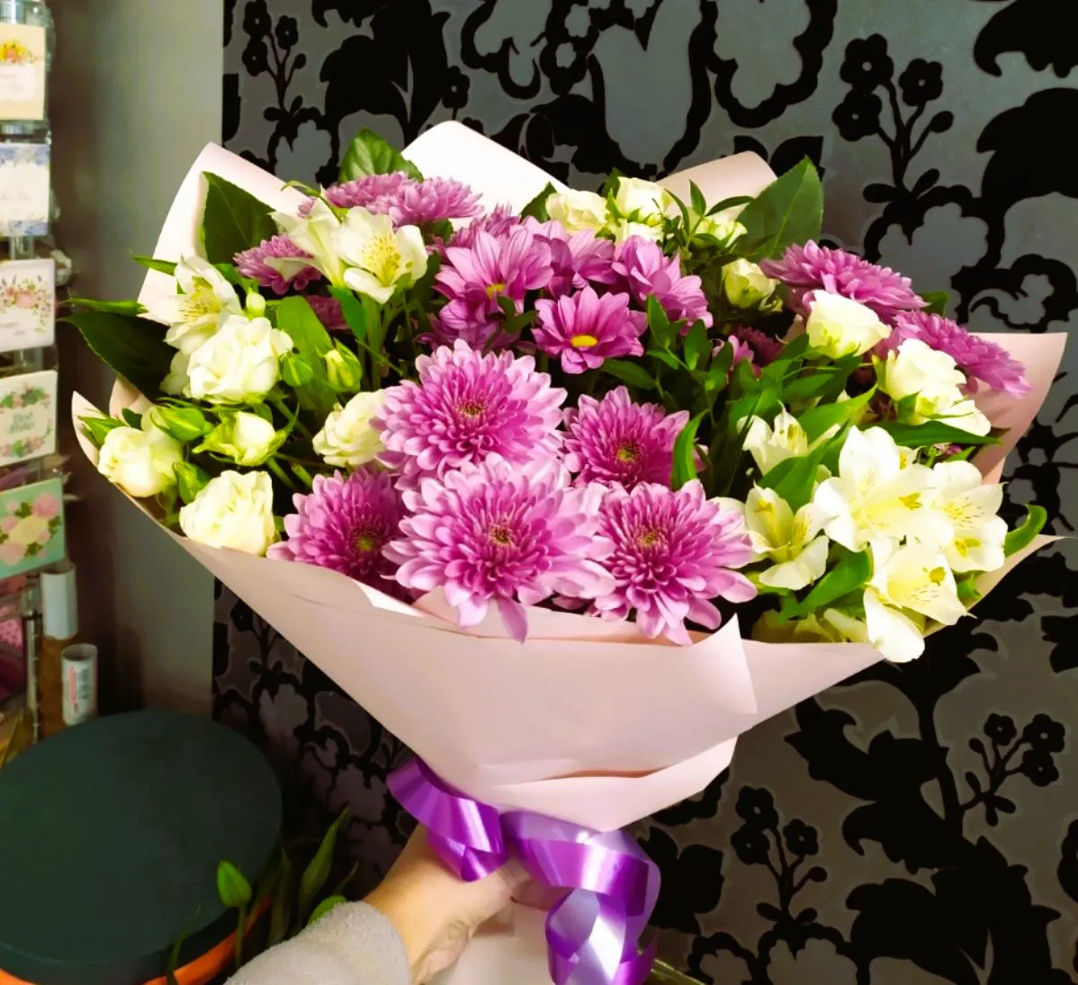 Кустовые хризантемы, кустовые розы, альстромерии, зелень